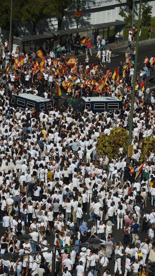 Los manifestantes, que se han convocado por las redes sociales, han llamado a los políticos a sentarse a la mesa y han mostrado pancartas y banderas blancas por la paz y contra la “represión policial”. Los asistentes a la concentración, donde se ha roto el silencio con aplausos y gritos al diálogo, no portaban ninguna simbología política. Sólo banderas y ropa blanca.