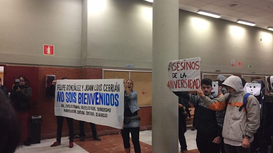 Los manifestantes han proferido gritos contra González y Cebrián cuando entraban a la Universidad, como “¡Fuera golpistas de la Universidad!”, “¡Felipe González, estás manchado de sangre!”, “¡Fuera terroristas de la Universidad” o “¡Fascistas!”. Algunos también han tirado un petardo dentro de la Facultad.