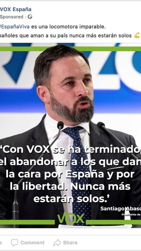 Vox está en campaña permanente en Facebook. La formación de Santiago Abascal ha apostado por una estrategia que pasa por intensificar sus anuncios en la red social, pagando para que esta dé más visibilidad a sus contenidos de lo que su algoritmo haría de forma predeterminada.