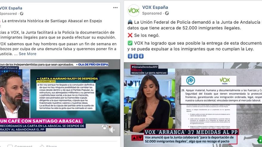 eldiario.es ha podido comprobar que la formación de Abascal también desinforma a través de Facebook. Entre los mensajes que promocionan, aseguran que “Vox ha logrado que sea posible la entrega de documentación [de 52.000 personas sin papeles en Andalucía] y se pueda expulsar a los inmigrantes que no cumplan la ley”. Esto no es cierto. Además, como explicó esta redacción, la legislación no lo permite. La normativa en materia de protección de datos prohíbe la cesión masiva de datos entre administraciones cuando la finalidad es diferente al objetivo para el cual se recogieron.