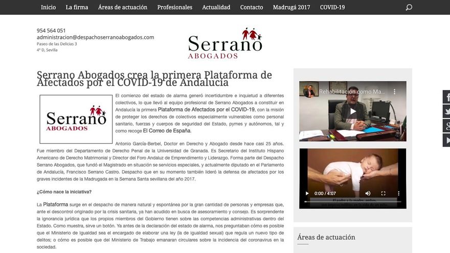 Lo cierto es que la propia web del despacho Serrano Abogados ha copiado íntegramente el contenido de la entrevista bajo el título “Serrano Abogados crea la primera Plataforma de Afectados por el COVID-19 de Andalucía” en un texto que comienza con la siguiente frase: “El comienzo del estado de alarma generó incertidumbre e inquietud a diferentes colectivos, lo que llevó al equipo profesional de Serrano Abogados a constituir en Andalucía la primera Plataforma de Afectados por el COVID-19”.