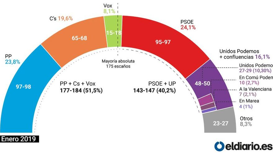 El bloque de las derechas más Vox tendría en estos momentos opciones de conformar una mayoría absoluta en el Congreso de los Diputados. La suma de las tres formaciones supone, según la encuesta, el 51,1% de los votos, frente al 40,2% que obtendrían la unión de PSOE y Unidos Podemos. En conjunto, los tres partidos de la derecha podrían ocupar un total de entre 177 y 184 escaños. La mayoría en el Congreso está ubicada en 176.