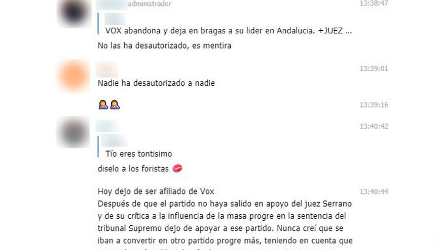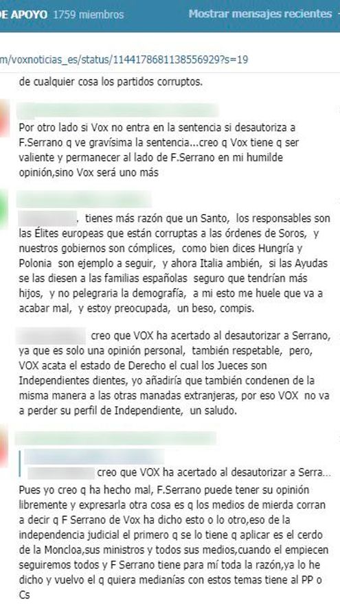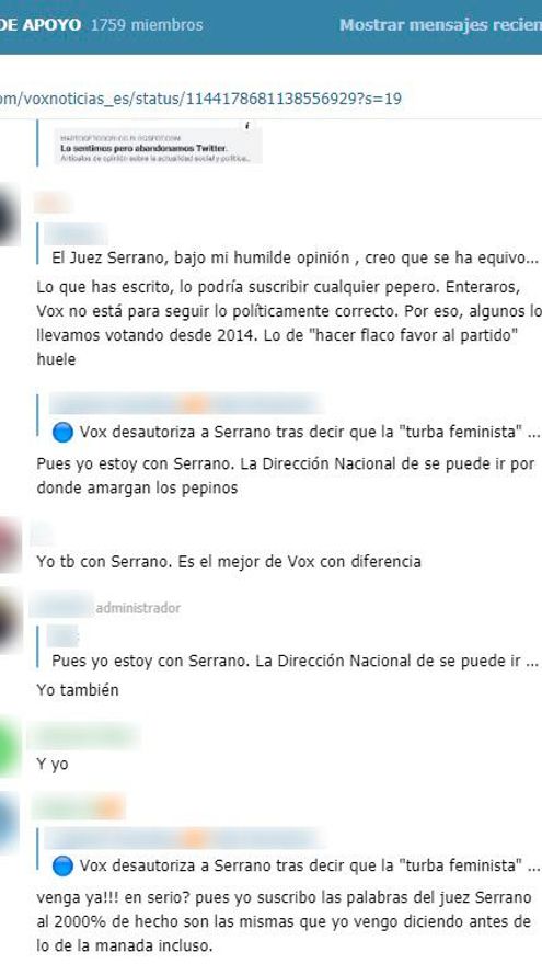 “Hoy dejo de ser afiliado de Vox”, reseña uno de ellos. “Después de que el partido no haya salido en apoyo al juez Serrano y de su crítica a la influencia de la masa progre en la sentencia del tribunal Supremo dejo de apoyar a este partido”, continúa este usuario. Ante el mensaje de otro miembro del grupo que considera que el político aludido se ha equivocado porque sus declaraciones “no son muy afortunadas”, varios simpatizantes le reprenden manifestando su apoyo al diputado andaluz. “Lo que has escrito lo podría suscribir cualquier pepero. Enteraros (sic), Vox no está para seguir lo políticamente correcto. Por eso, algunos lo llevamos votando desde 2014”, incide uno de ellos.