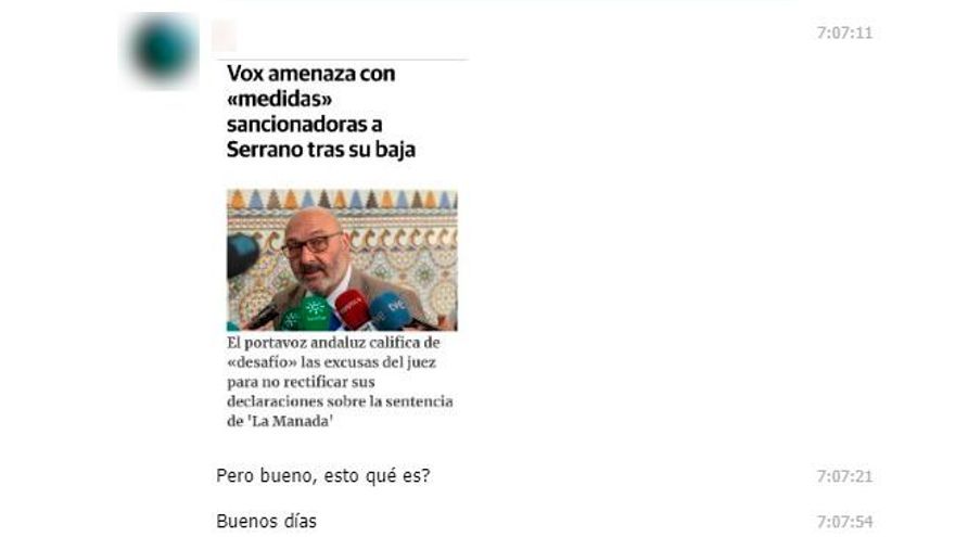 En algunos canales de comunicación afines al partido la dinámica es parecida. Si surge algún comentario crítico, uno de los administradores advierte de que es un “grupo de apoyo a Vox” y que esos mensajes “no ayudan nada” a la formación. Así ha sucedido durante los últimos días en un canal Telegram que cuenta con 1.500 miembros y en el que los seguidores han ido mostrando su desconcierto por la postura del partido ante los comentarios de Serrano. En este canal, que se llama “Vox grupo de apoyo” y en el que dejan claro que es una vía “no oficial” para “comentar los avances” de la formación, algunos usuarios han mostrado su desencanto y su incomprensión por la postura del partido de extrema derecha en uno de los primeros conflictos orgánicos que afrontan desde que están presentes en todas las instituciones.
