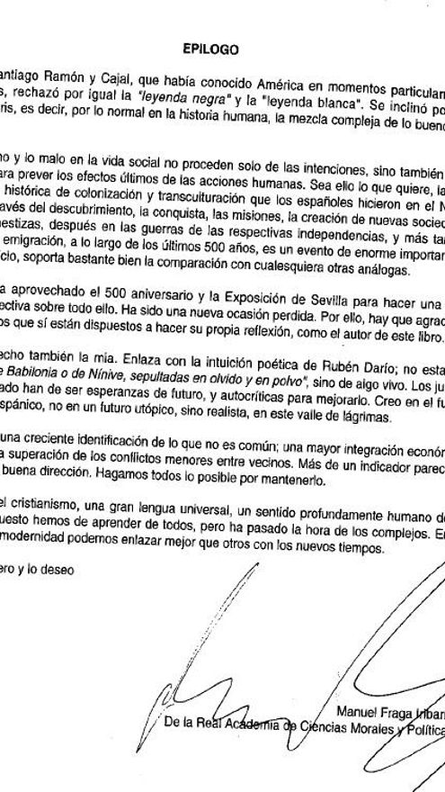 Con esa parte del texto sí estaba de acuerdo Fraga, que se encargó de redactar un epílogo de cinco párrafos para el autor. En esa pequeña conclusión para lamentar que no se hubiera realizado una “reflexión colectiva” sobre la “gran experiencia histórica de colonización y transculturación que los españoles hicieron en el Nuevo Mundo”. “No se ha aprovechado el 500º aniversario y la Exposición de Sevilla para hacer una gran reflexión colectiva sobre todo ello -criticaba el presidente gallego-. Hay que agradecer y felicitar a los que sí están dispuesto a hacer su propia reflexión, como el autor de este libro”.