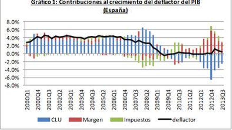 En el gráfico 1 descomponemos el crecimiento del deflactor del PIB (un índice que recoge la evolución de los precios de todos los bienes y servicios producidos en un país) en tres componentes: el crecimiento de los CLU, el crecimiento de los márgenes de beneficios y el crecimiento de los impuestos indirectos. La información que ofrece es clara. Si entre los años 2010 y 2013 la devaluación salarial ha hecho que los CLU caigan cada año un 2,4%, la subida de los márgenes de beneficios provocaron una subida anual del deflactor del 2%. Como además el gobierno español llevó a cabo subidas de impuestos indirectos para contribuir a la reducción del déficit que impulsaron el deflactor del PIB otros 0,7 puntos porcentuales cada año, la tasa de inflación anual fue en realidad ligeramente positiva. (Esta tasa de inflación es diferente a la que se recoge con el IPC; miden dos cosas diferentes).