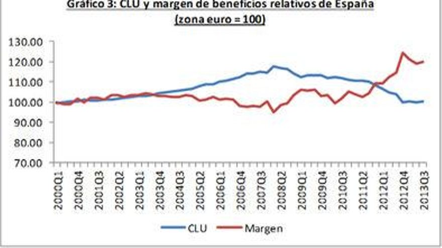 La respuesta es que no: en realidad, a pesar de la bajada tan importante que se ha producido en los salarios y los CLU, no se ha producido una mejora igual de competitividad-precio, porque las bajadas salariales están siendo compensadas por aumentos de los márgenes de beneficios empresariales (y en parte también de los impuestos indirectos). Y es que, cuando se habla de precios y de competitividad, normalmente se sitúa toda la carga del ajuste en los trabajadores, pero se olvida que el beneficio es también una parte de esos precios.