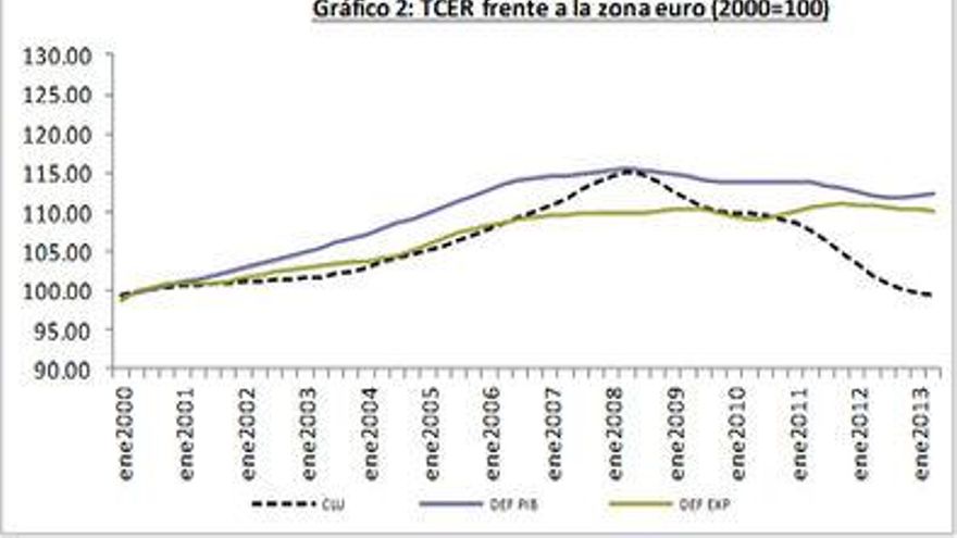 El gobierno español se ha entregado de forma decidida a esta política, principalmente a través de la reforma laboral. Y, efectivamente, los salarios nominales redujeron primero su crecimiento de forma muy marcada, y desde el último trimestre de 2012 están incluso decreciendo. Como consecuencia, también se han reducido los CLU en términos absolutos y en relación con el resto de países de la zona euro. La eliminación del déficit por cuenta corriente, el crecimiento de las exportaciones registrado en 2013 y el fin de la recesión –que no de la crisis- están siendo esgrimidos por las autoridades como la prueba definitiva de que se está produciendo esta mejora en la competitividad, y que la devaluación interna está siendo eficaz. ¿Es cierto?