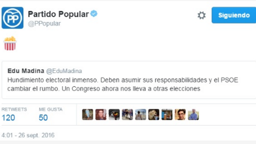 Esta no es la primera vez que los responsables de las redes sociales del Partido Popular publican un mensaje cómico para borrarlo al poco tiempo. Así sucedió tras las elecciones autonómicas vascas y gallegas del 25D cuando compartieron un tuit de el diputado Eduardo Madina lamentando los resultados del PSOE junto con un emoticono de un cubo de palomitas, del que también se arrepintieron luego.