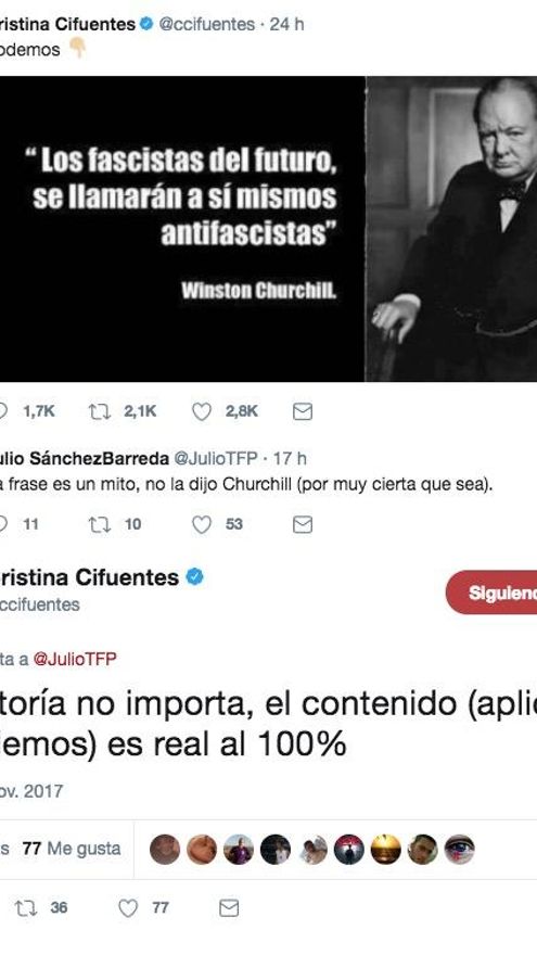 Ante los reproches, Cristina Cifuentes ha respondido a uno de los usuarios de Twitter que ha advertido a la presidenta de la Comunidad de Madrid de que la frase no fue pronunciada por Churchill que “la autoría no importa” porque “el contenido aplicado a Podemos es real al 100%”. Varias horas después, Cifuentes mantiene el tuit en su perfil.