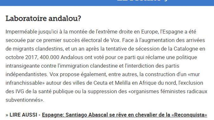 “Impermeable hasta ahora al surgimiento de la extrema derecha en Europa, España fue sacudida por este primer éxito electoral de Vox”, subraya el periódico francés Le Figaro, que sitúa el auge de esta corriente en “el aumento de número de inmigrantes ilegales” y en “el intento de Catalunya de separarse”. El periódico califica el pacto con la extrema derecha en la región de “laboratorio andaluz”, que servirá para medir posibles fórmulas de cara a las elecciones de mayo.