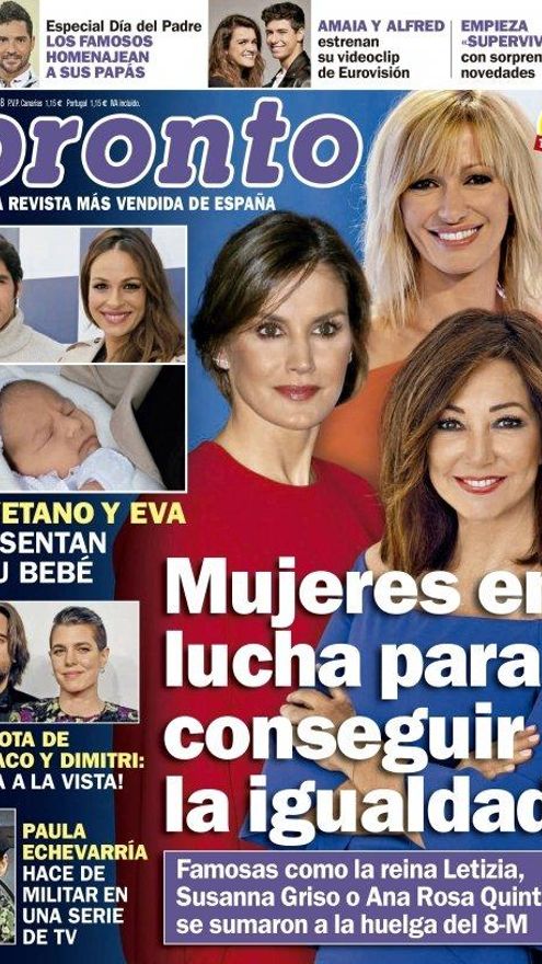 La última señal de que el 8m ha llegado lejos es la nueva portada de la revista Pronto, especializada en cotilleos. La publicación ha cambiado primera en el último momento para recoger el apoyo de Susanna Griso, Ana Rosa Quintana y la reina Leticia con el titular “Mujeres en lucha para conseguir la igualdad”.