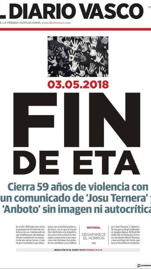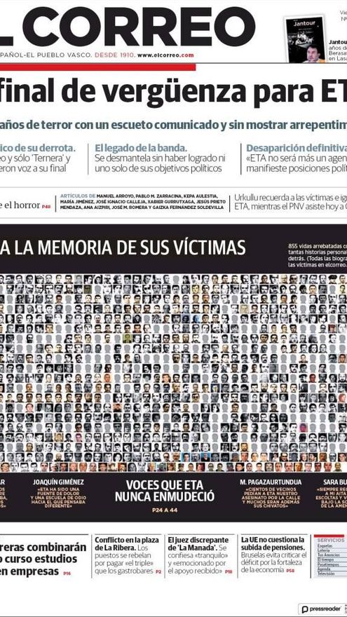 En la prensa local vasca, El Correo titula “Un final de vergüenza para ETA” y pone en portada fotografías de las víctimas a modo de homenaje. El Diario Vasco dedica toda su portada a la noticia, abriendo toda ella con un “Fin de ETA”.