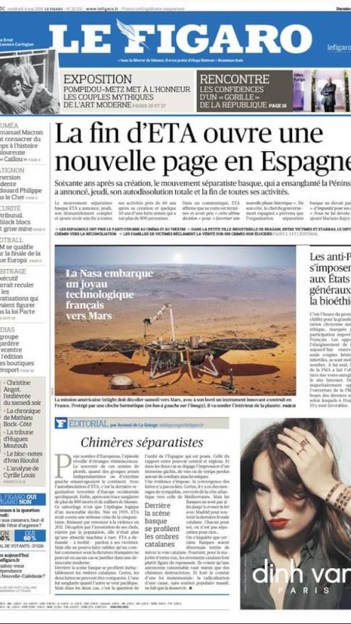 El cese de la banda terrorista también ha llegado a la prensa internacional. El diario francés Le Figaro abre su edición de hoy con “El fin de ETA abre una nueva página en España”.