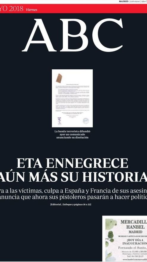 El periódico El País dedica su cabecera a la disolución de la banda, bajo el titular “ETA desaparece entre el rechazo masivo y la admisión de su fracaso”, destacando que no han conseguido ninguno de sus objetivos políticos y remarcando los 854 asesinatos. Hacen lo propio el resto de diarios —El Mundo, La Razón, La Vanguardia o ABC— siendo la portada de este último prácticamente negra en señal de luto a las víctimas, a las que ETA no ha hecho referencia en su despedida.