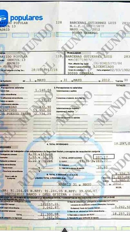 El diario El Mundo publicó el pasado domingo la nómina que el extesorero del PP Luis Bárcenas tuvo durante su último periodo como trabajador del partido. Según dicha información, Bárcenas fue en 2010 y 2011 el mejor pagado en el PP, por delante del presidente de la formación, Mariano Rajoy.