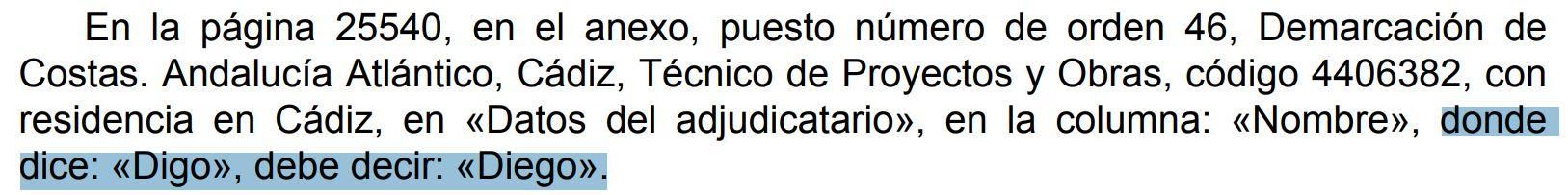 Lo publicado hoy es la subsanación de un error del BOE del pasado 4 de Marzo. En el mismo se publicaba la resolución de un concurso llevado a cabo por el Ministerio de Transición Ecológica y, más en concreto, la Demarcación de Costas en Andalucía. Se buscaba un profesional que ocupase el puesto de Técnico de Proyectos y Obras en Cádiz. El Boletín Oficial del Estado publicó que el puesto recaía en un tal 'Digo', en lugar de 'Diego', el nombre del profesional que ha obtenido la plaza.