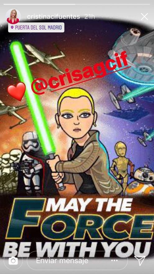 Sin embargo, este mensaje no es una excepción. La dirigente popular ha publicado durante varios días imágenes en su cuenta de Instagram mostrando “una pausa en el trabajo y el café”, un bonito ramo de flores, unos guantes de boxeo personalizados o una viñeta de la Guerra de las Galaxias. Siempre con la ubicación de “Puerta del Sol”.