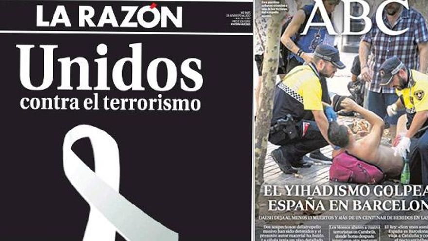 Por su parte, ABC señala que “El yihadismo golpea a España en Barcelona” y La Razón: “Unidos contra el terrorismo. Brutal atentado yihadista en las Ramblas de Barcelona: al menos 13 muertos y 100 heridos”. Más detalles de los que lleva La Razón en su portada teñida de negro en la que se puede ver con crespón blanco acompañado por cuatro palabras: “Unidos contra el terrorismo”.