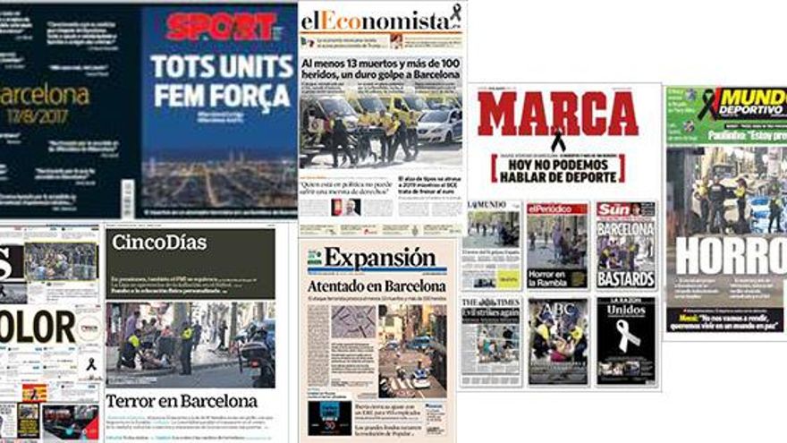 “Terror en Barcelona. Un islamista causa 13 muertos y cien heridos con una furgoneta en la Rambla. Hay dos detenidos, pero ninguno es el autor material del atentado”, informa el periódico catalán La Vanguardia. En la misma línea, El Periódico titula “Horror en la Rambla” y prosigue: “13 muertos y más de 80 heridos en el atentado de Barcelona, reivindicado por el Estado Islámico. Una furgoneta atropella a decenas de personas en un zigzag de 500 metros”.