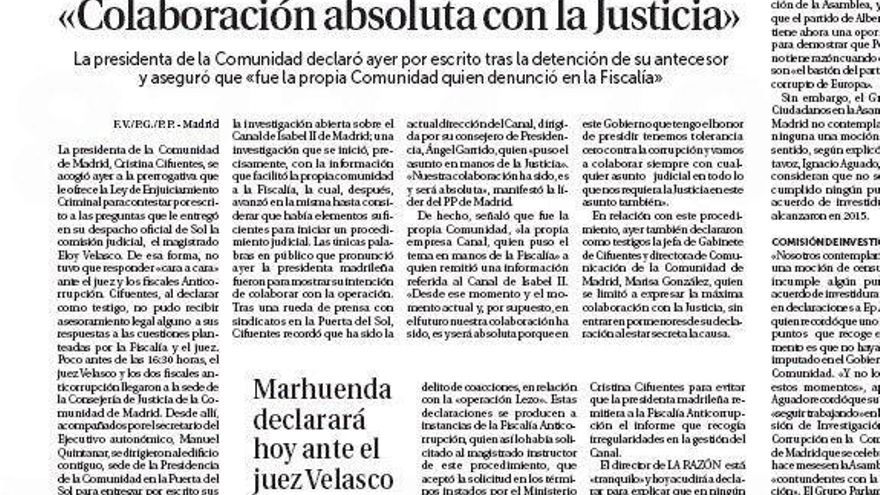 “El director de 'La Razón' está ”tranquilo“ y hoy acudirá a declarar para explicar que en ningún momento ni él ”ni nadie de este periódico“ han realizado campaña alguna para intimidar o acosar a la presidente de la Comunidad ni a su entorno. De hecho aportará pruebas de que todas las informaciones publicadas sobre Cifuentes son veraces, objetivas y ajustadas a los hechos”.