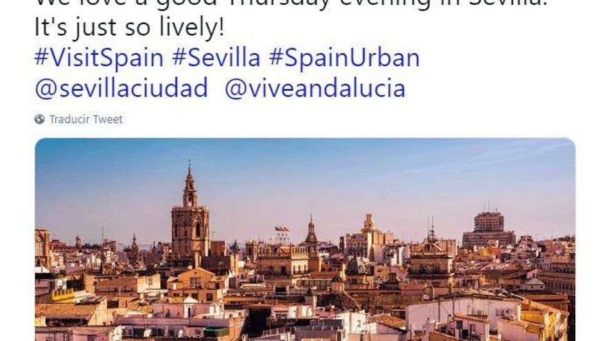 La cuenta oficial de Turismo de España en Twitter (@spain), ligada al Ministerio de Industria, Comercio y Turismo, ha publicado este jueves un tuit con el fin de promocionar la ciudad de Sevilla. No obstante, junto al texto promocional “Nos encanta una buena tarde de jueves en Sevilla, ¡es tan animada!”, no aparece ni la Giralda, ni el Parque de María Luisa, sino una imagen de... Valencia.