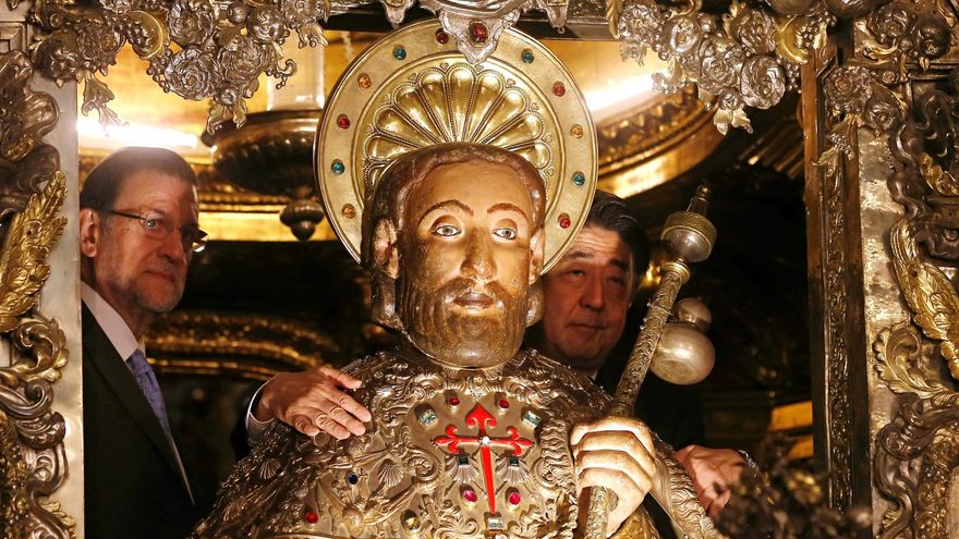 Rajoy y Abe, acompañados de su mujeres, han visitado el Monumento al Peregrino en el Monte do Gozo y han presenciado la 'ceremonia del botafumeiro', un rito de purificación originario de la Edad Media, en la Catedral de Santiago. Allí, junto al presidente de la Xunta de Galicia, Alberto Núñez Feijóo, han posado abrazando la talla del Apóstol.