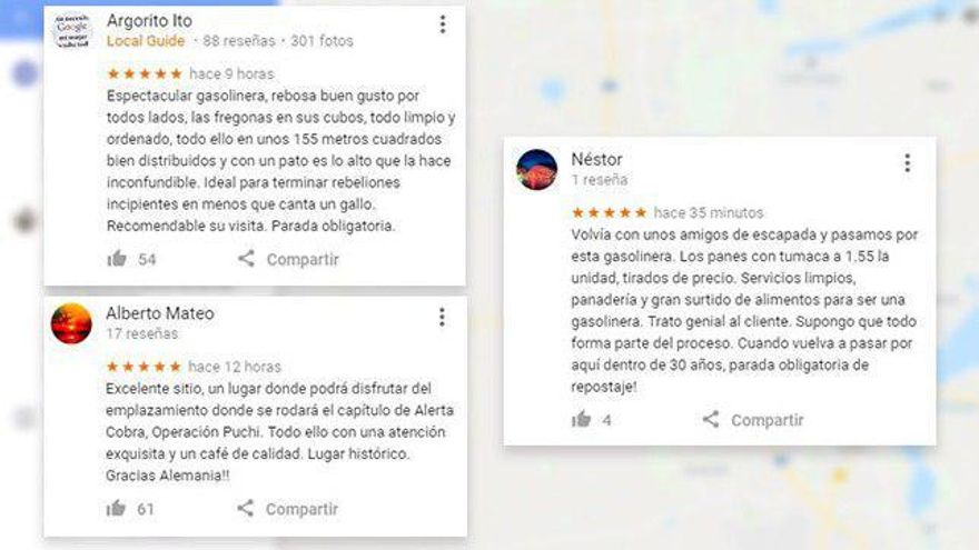 Desde ahí, la gasolinera no ha dejado de recibir 5 estrellas de puntuación acompañados de reseñas positivas en la mayoría de casos. La mayoría se dedica a bromear o hacer mofa con la situación de Catalunya y con el arresto del expresident catalán. También hay multitud de insultos y burlas contra Puigdemont, que nada tienen que ver con el humor.