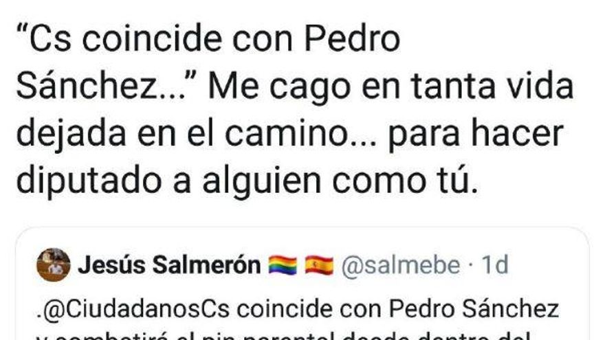 Poco después Salmerón había borrado el tuit de su cuenta y ya no se podía acceder a leerlo, pero otros usuarios se han hecho eco de su comentario y de la reacción del exportavoz parlamentario, algunos vaticinando que a Girauta ya solo le queda recalar en Vox, dado que es uno de los pocos partidos en donde aún no ha militado.