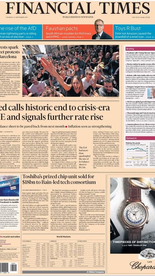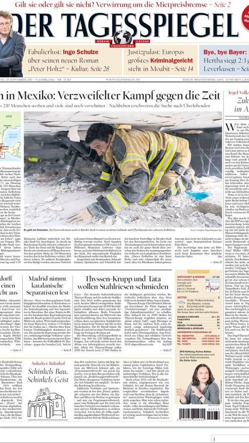 En Alemania, Der Tagesspiegel y el Frankfurter Allgemeine Zeitung informan en sus portadas de lo acontecido en Catalunya. El primero titula “Madrid alimenta el conflicto con los catalanes” y el segundo recoge las declaraciones del presidente de la Generalitat, Carles Puigdemont: “Puigdemont: estado de excepción real”.