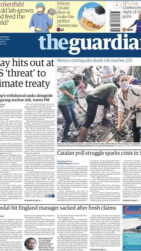 En Reino Unido, The Times y The Guardian abordan el asunto en portada, con titular destacado en este segundo periódico centrado en las protestas posteriores a la operación policial: “La pugna por el referéndum catalán desata una crisis en España”