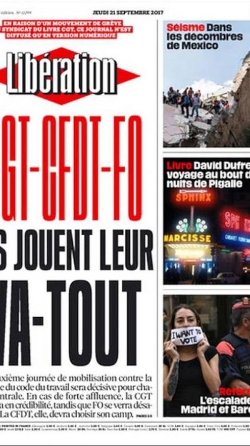 El diario francés dedica una de sus fotografías de su portada a las manifestaciones que se produjeron en Barcelona tras las detenciones. La instantánea captura el momento en que una mujer, al lado de un agente de los Mossos d'Esquadra, se tapa la boca con un papel con la frase: “I want to vote”.
