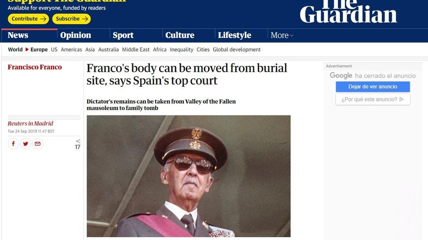 En este sentido, el diario británico The Guardian también se ha hecho eco del fallo del Tribunal Supremo. “El Gobierno trasladará los restos de Franco tras el visto bueno de la Justicia”, informan en la portada de su edición digital. Asimismo, indican que se calcula que en el complejo hay alrededor de 34.000 muertos. “Incluyendo muchos de los que lucharon por el bando perdedor republicano y cuyos cuerpos fueron movidos a este lugar durante la dictadura de Franco sin el permiso de los familiares”.