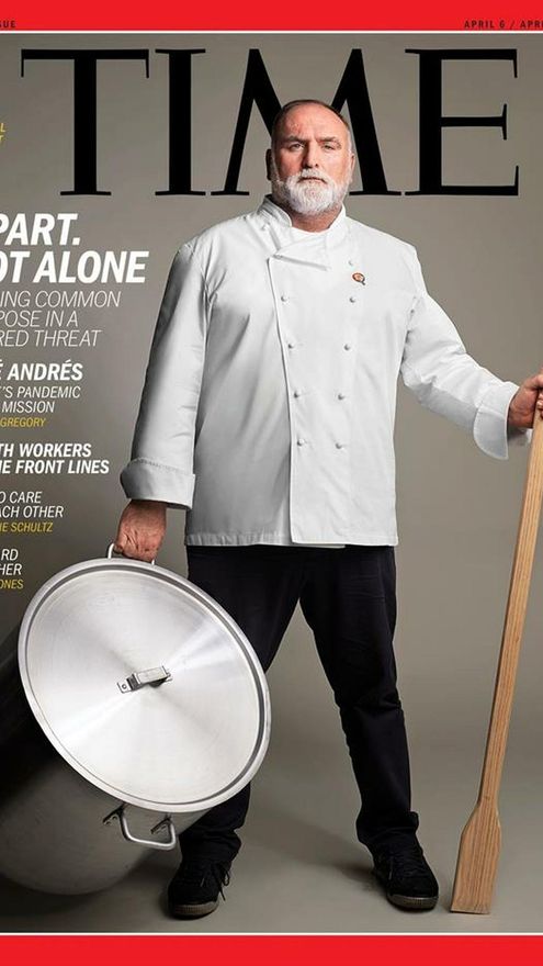 Como una especie de Quijote de los fogones y, también, con algo de intrépido marino. Así luce el chef español José Andrés en la portada de la revista 'Time' de abril, un especial llamado “Separados pero no solos” que se centra en los esfuerzos de diferentes figuras por encontrar un “propósito común” para hacer frente a la “amenaza compartida” del COVID-19: en el caso del popular cocinero, a través de su proyecto humanitario World Central Kitchen, que tiene como objetivo alimentar a la gente en tiempo de crisis.