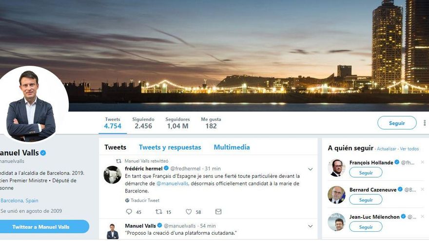 El recién anunciado candidato a alcalde de la ciudad condal se lo ha tomado al pie de la letra y ha comenzado su campaña en una de sus plataformas más importantes: su cuenta de Twitter. El que fuera ministro de Interior con el expresidente francés François Hollande se ha puesto manos a la obra y ha dejado su nacionalidad francesa detrás. Esta era su cabecera de Twitter el pasado 23 de septiembre: