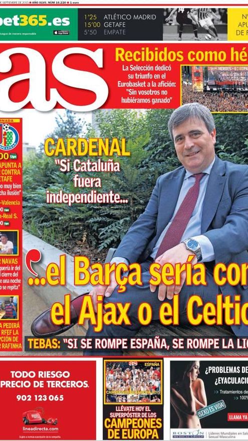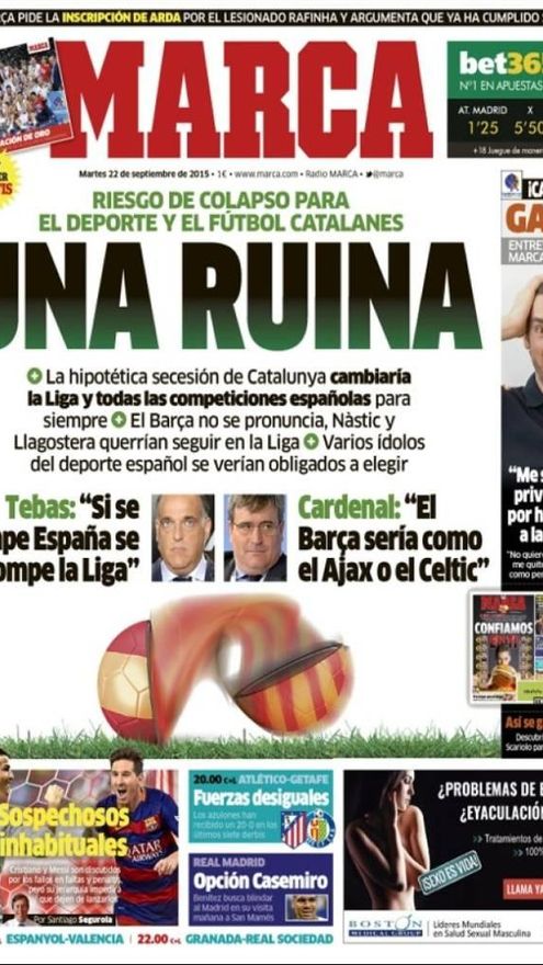 Marca, el periódico más vendido de nuestro país, lleva a su primera con gran tipografía la palabra 'ruina' y advierte de que el deporte y el fútbol catalanes se enfrentan a un “riesgo de colapso” si se produce la independencia. Por su parte, el diario AS dedica su portada a las palabras del presidente del Consejo Superior de Deportes, Miguel Cardenal: “Si Cataluña fuera independiente, el Barça sería como el Ajax o el Celtic”.