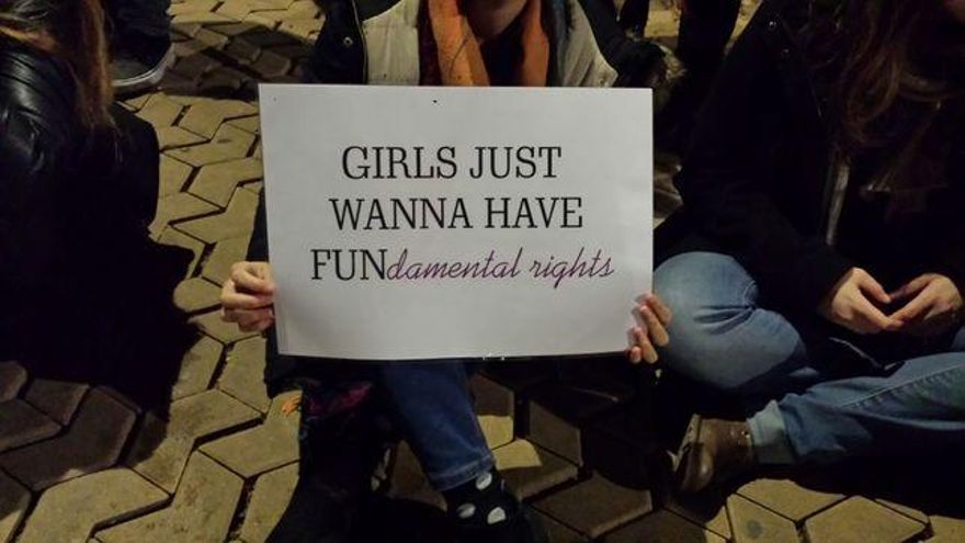 En este caso se toma el título de una conocida canción pop de Cindy Lauper, “Girls just wanna have fun” y se le añade “fun-damental rights”. El significado de la frase pasa de ser “Las chicas solo quieren pasarlo bien” a “Las chicas solo quieren tener derechos fundamentales”.