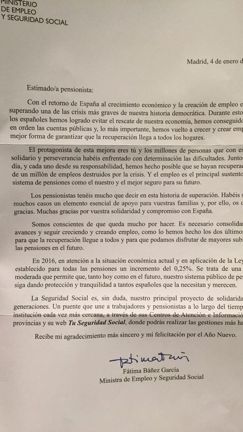 “El protagonista eres tú y los millones de personas que con su esfuerzo solidario y perseverancia habéis enfrentado con determinación las dificultades”. Con este tono directo y desenfadado, la ministra de Empleo en Funciones, Fácima Báñez, se ha dirigido este año a millones de pensionistas para notificarles que les sube en un 0,25% las pensiones. Báñez ha hecho habitual el envío de esta misiva bajo su mandado, añadiendo en cada endición más profusión de elogios a los logros económicos del Gobierno de Mariano Rajoy.