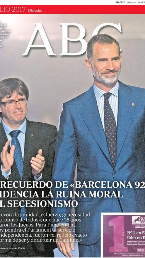 ABC tampoco habla de la declaración del presidente del Gobierno. Dedica la totalidad de su portada al encuentro de Puigdemont y Felipe VI en el aniversario de los Juegos de Barcelona. Ninguna referencia por parte del diario de Vocento.