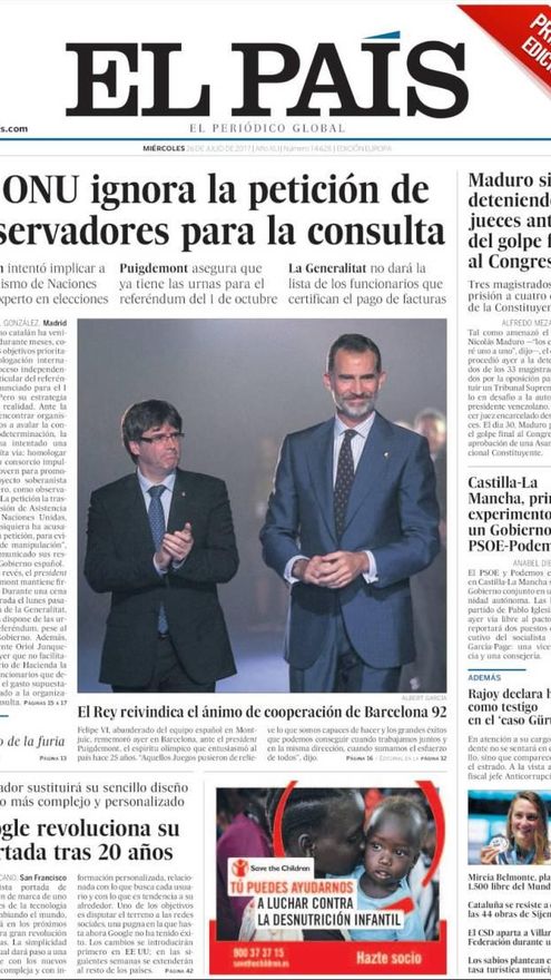 El País abre su portada con la consulta catalana y las declaraciones del rey en la conmemoración de Barcelona 92', relegando a un pequeño titular encabezado con un “además” a Rajoy y su declaración en la Audiencia Nacional. Así, el diario da más espacio en la primera página al cambio de imagen de Google que a la noticia de la Gürtel.