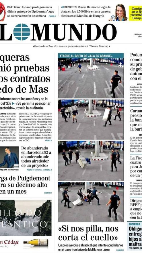 El Mundo abría este 26 de junio su versión impresa con Junqueras, Puigdemont y el aniversario de Barcelona '92. Dedica, además, todo el peso gráfico al ataque de ayer en Melilla, pero el rotativo ni siquiera nombra la testificación de Rajoy en su columna derecha. Ni una sola mención al juicio de la Gürtel.