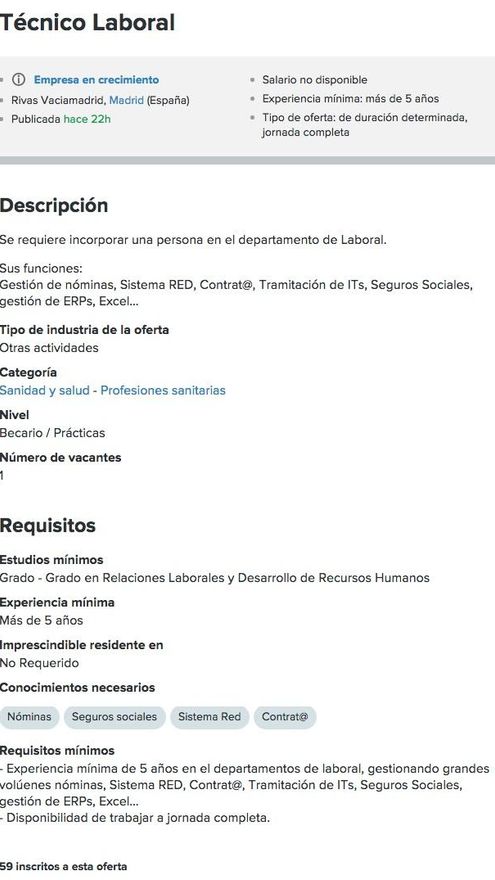 La empresa que hace esta oferta está situada en Rivas Vaciamadrid, y se dedica al ámbito de la salud. El aspirante que busca debe ser graduado en Relaciones Laborales y trabajaría en el departamento laboral, donde gestionaría nóminas o los seguros sociales de la compañía.