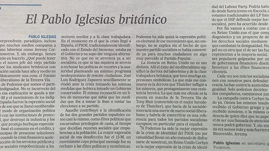 Iglesias analiza el tirunfo de Corbyn en un artículo de opinión en El País que se publica este lunes. En él, asegura que “cada vez son más los socialistas que vienen con nosotros para defender la dmocracia, luchar contra la austeridad y la desigualdad”.