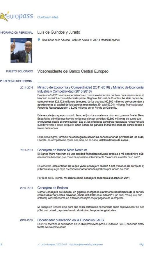 Entre la experiencia laboral del currículum falso de Luis de Guindos se recoge que, como director de la filial española de Lehman Brothers, su mayor logro “fue no atisbar la magnitud de la quiebra de este gigante bancario”. “Entre otros logros, también he conseguido salvar las concesionarias privadas de las autopistas”, bromea Izquierda Unida en el documento ficcionado.