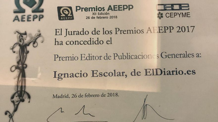 La Asociación Española de Editoriales de Publicaciones Periódicas (AEEPP) ha premiado hoy al director de eldiario.es, Ignacio Escolar. En un comunicado, la AEEPP asegura que para la concesión de estos galardones ha tomado en consideración el carácter innovador de las publicaciones, de los trabajos o de los editores que presentan sus candidaturas.