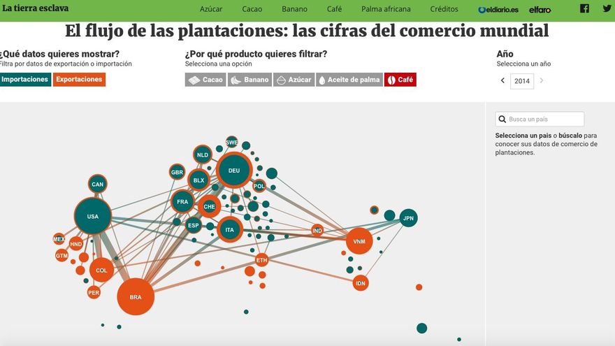 'La tierra esclava', publicado el 25 de abril, es un especial de investigación y reportajes desarrollado por la redacción de eldiario.es durante un año en colaboración con El Faro, un medio de referencia para el periodismo de calidad en Latinoamérica. El proyecto es una radiografía económica y humana de cinco de las grandes plantaciones que consumimos en Europa: azúcar, cacao, banana, palma africana y café.