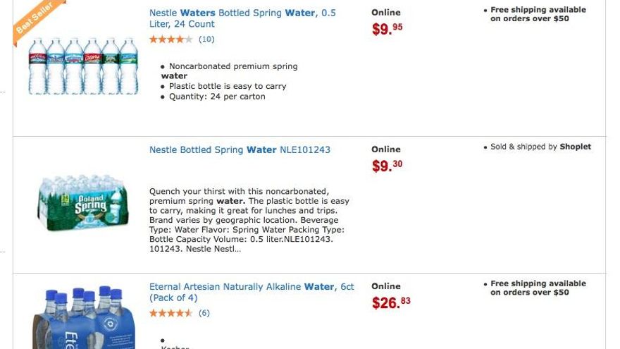 Por comparar, aquí lo que aparece al buscar agua en Wal-Mart, una gran cadena estadounidense. Puedes ordenar los productos de diferentes formas, ver más o menos productos por página, el precio está destacado y aquí sí hay imágenes.