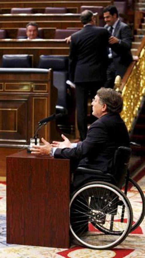 Sentado en su silla de ruedas, como lleva haciendo los últimos 40 años, posa en el estudio del fotógrafo con atuendo desenfadado y elegante, un juvenil flequillo bien peinado hacia la derecha y ojos que miran curiosos a todo aquello que la vida quiera llevarle a su encuentro. Porque a este diputado en Cortes por Toledo nada humano le es ajeno; sus semejantes le divierten, le interesan, incluso el más detestable de todos ellos tiene para él un punto de morbo que no está dispuesto a desperdiciar. Dotado de un incombustible sentido del humor, diríase que el destino puso en su camino una lesión medular para rizar más el rizo de una indomable alegría de vivir.