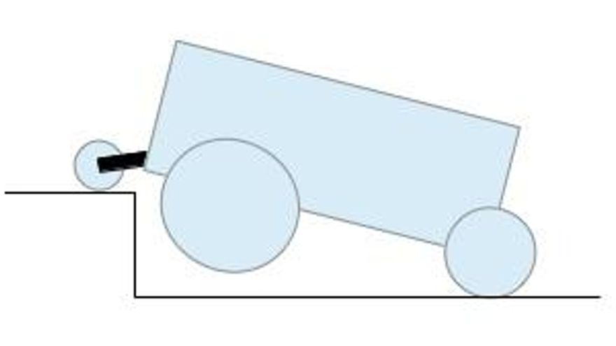 También, cuando vamos a un negocio, bar, edificio, y queremos que un amigo nos ayude a subir un bordillo alto empinando la silla y luego empujándonos, las (tremendamente bien diseñadas) rueditas hacen tope detrás (como se ve en mi hermosa figura esquemática) e impiden que las ruedas delanteras puedan salvar el obstáculo: