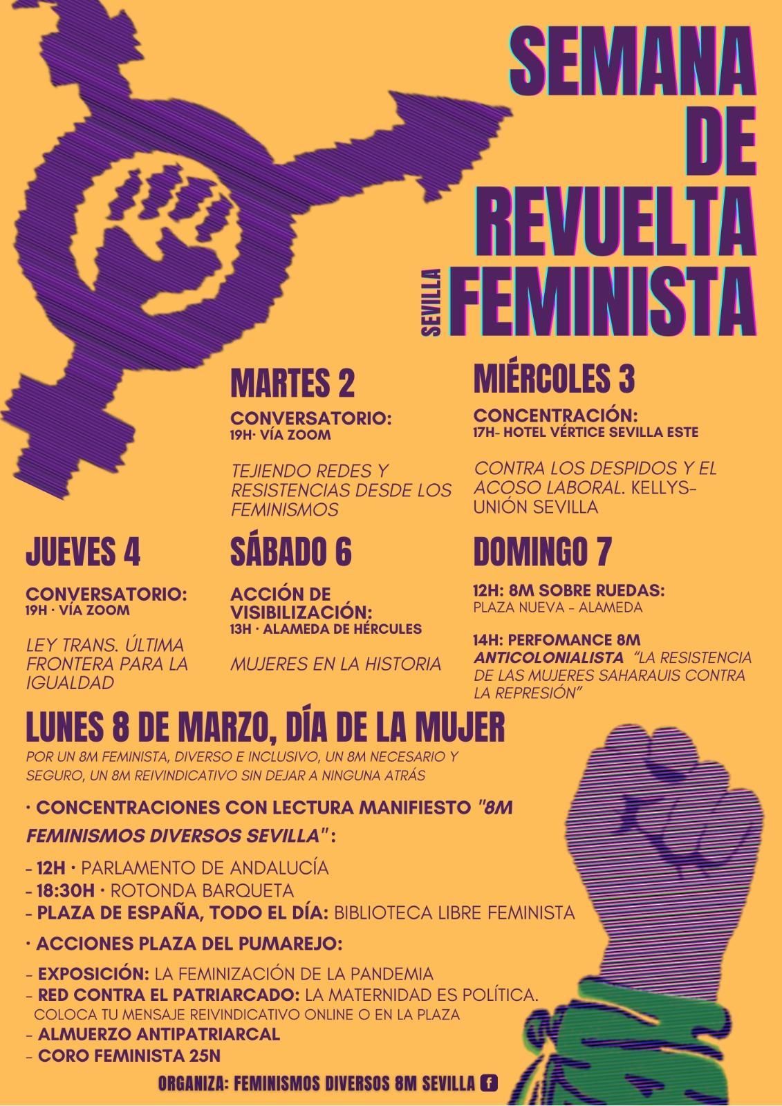 Por su parte, la Semana de Revuelta Feminista se completa con encuentros y charlas virtuales, y el domingo 7 a las 12 arrancará en la Plaza Nueva una marcha sobre ruedas (bicicletas, carritos de bebé, sillas de rueda, patines…) que llevará hasta la Alameda, donde a las 14 horas se celebrará la performance anticolonialista ‘La resistencia de las mujeres saharauis contra la represión’. Ya el 8M, la Plaza de España se convertirá en una Biblioteca Libre Feminista, donde se podrán llevar o recoger volúmenes, mientras que en la Casa del Pumarejo se ofrecerá un almuerzo antipatriarcal y se podrá ver la exposición ‘La feminización de la pandemia’.